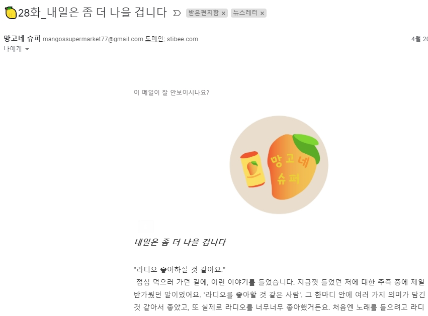 뉴스레터 서비스명도 '망고네 수퍼'입니다.   서비스명과 메일 제목이 잘 매칭되는 것을 알 수 있습니다.