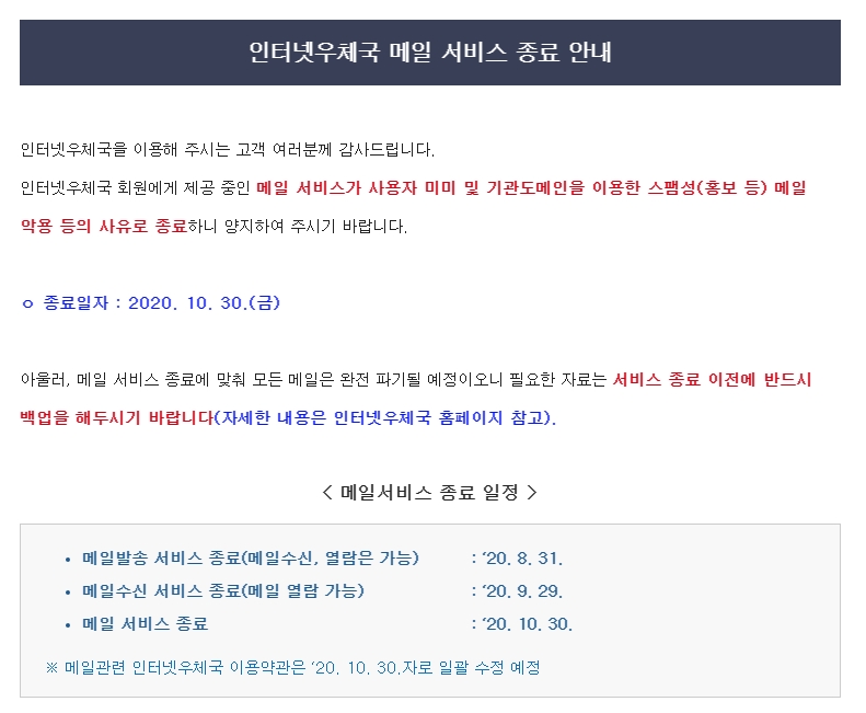 [썬더메일] ⚡ - 인터넷우체국 메일 서비스 종료 안내, 종료일자: 2020. 10. 30.(금)