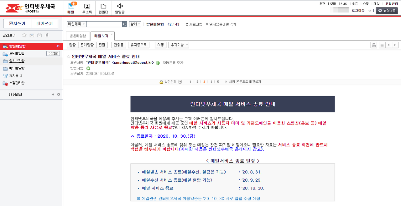 [썬더메일] ⚡ - 인터넷우체국 메일 서비스 종료 안내, 종료일자: 2020. 10. 30.(금)