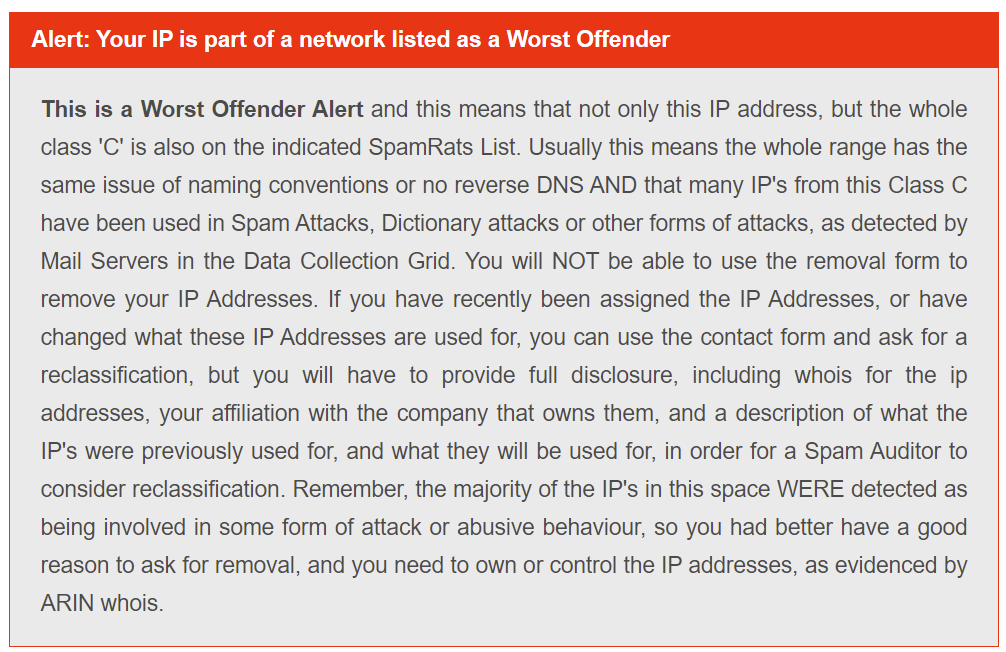 하지만, 최근 일부 스팸필터 장비에서 spamrats의 디비를 참조하고 있습니다. 탐지가 아닌 '차단' 정책을 스팸필터 장비에서 사용하고 있다면 메일 수신이 차단되겠죠.
