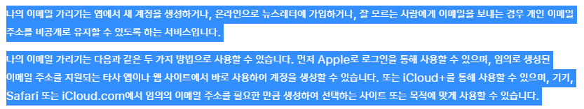요약을 하면 자동으로 임의의 메일주소가 생성되어 사용도 가능하고, 아이클라우드 유료 구독자는 사용자가 선택적으로 메일 계정 생성도 가능하다고 설명되어 있습니다. 특히, 애플로그인이 지원되는 앱으로 애플계정으로 로그인했을 경우 자동으로 작동되는 것을 유추할 수 있습니다.