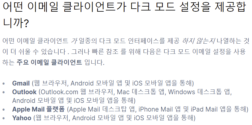 이메일 클라이언트도 다크모드를 지원하지만 모바일 기기의 운영체제 자체에서도 다크모드를 지원합니다.