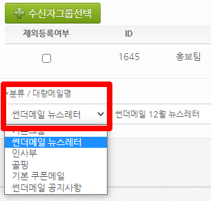 대량메일 작성 1단계에서 분류를 선택합니다. 매번 발송할 때 마다 선택을 합니다. 그래야 수신거부 시 이것을 기준으로 수신거부 기능을 사용할 수 있습니다.