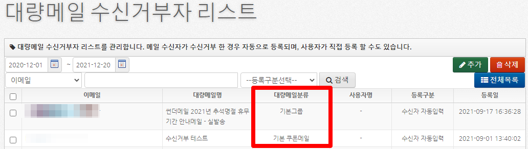 대량메일 - 수신거부자 리스트 - 대량메일분류