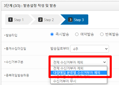 작성 3단계의 '수신거부구분'에서 '대량메일 분류별 수신거부자 제외'를 선택합니다.