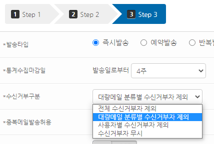 작성 3단계의 '수신거부구분'에서 '대량메일 분류별 수신거부자 제외'를 선택합니다.