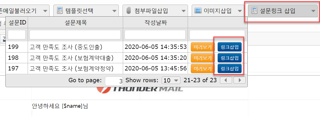 썬더메일에는 설문조사솔루션으로 와이즈서베이가 있습니다.