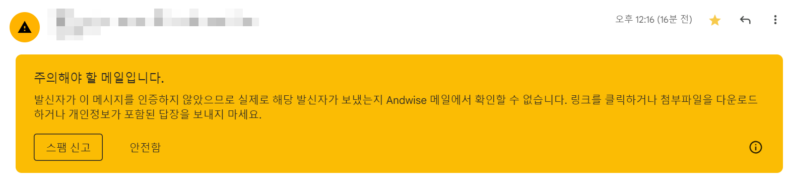 테스트를 진행하며 신규 발송메일주소에 SPF 설정 없이 테스트 발송을 해봤습니다. 스팸성 메일로 인식을 합니다.