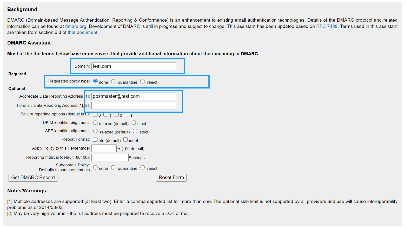 v=DMARC1; p=none; rua=mailto:postmaster@test.com