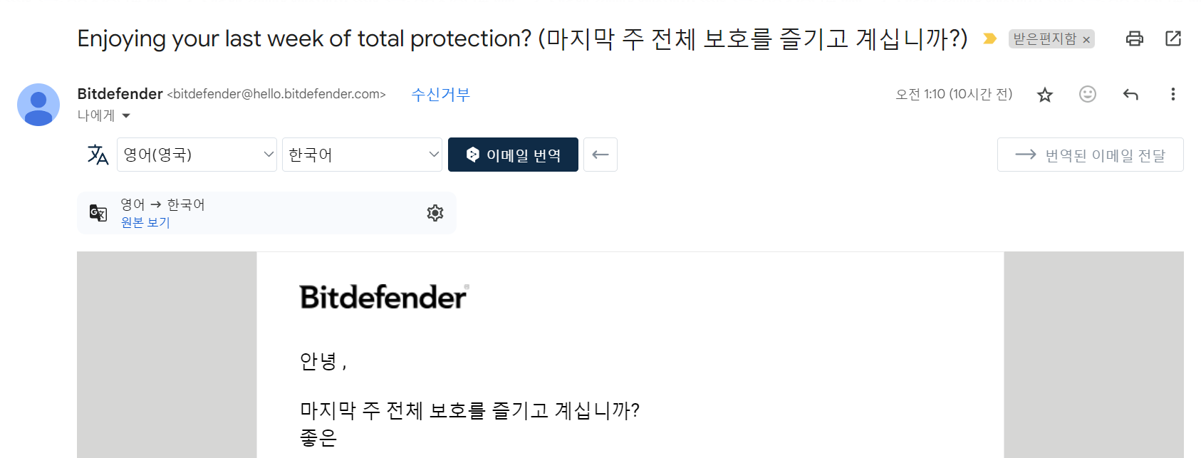보낸사람의 메일 주소도 일발적으로 사용하는 메일주소가 아닌 'hello.bitdefender.com'을 사용하고 있습니다.