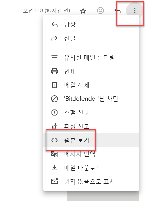 '원본보기'에서 반송메일 주소를 확인 합니다.