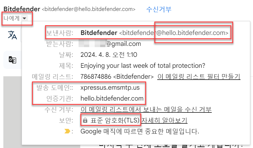 실제 메일 발송은 비트디펜더가 발송하지 않은 것을 알 수 있습니다. 'xpressus.emsmtp.us'라는 곳에서 발송했네요.
