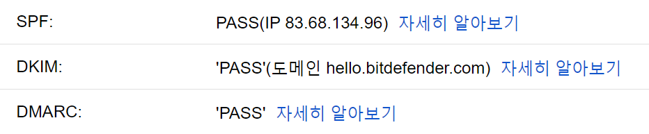 SPF, DKIM, DMARC가 통과 된 것을 보니 hello.bitdefender.com에 관련 설정들이 되어 있을 것입니다.