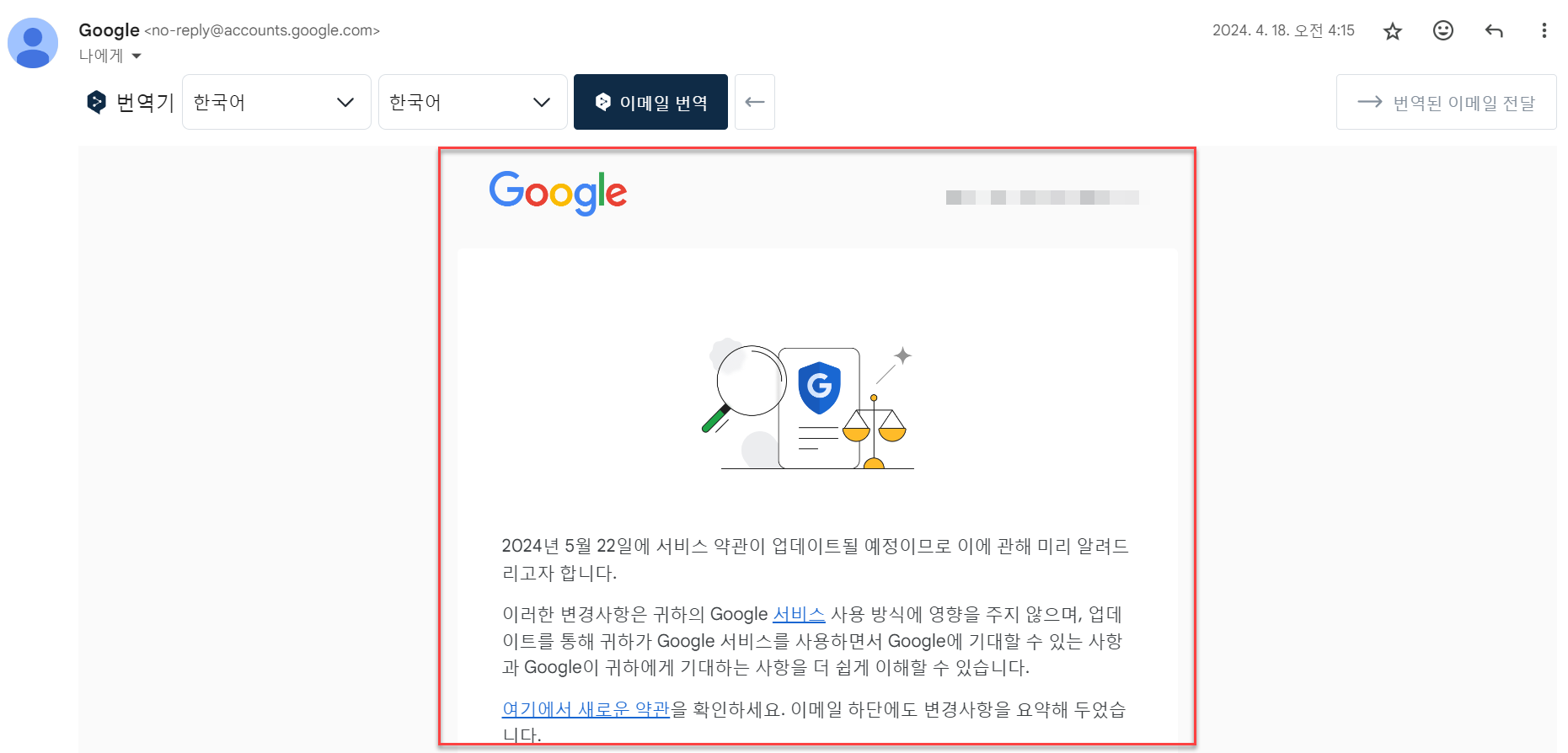 <p style="margin:25px 0;font-family:Roboto, Helvetica Neue, Helvetica, Arial, sans-serif;color:#5f6368;line-height:1.5;font-size:16px"><span style=font-size:14px;>Google 서비스 약관의 중요 변경사항을 알려 드리기 위해 발송된 이메일입니다.</span></p>
