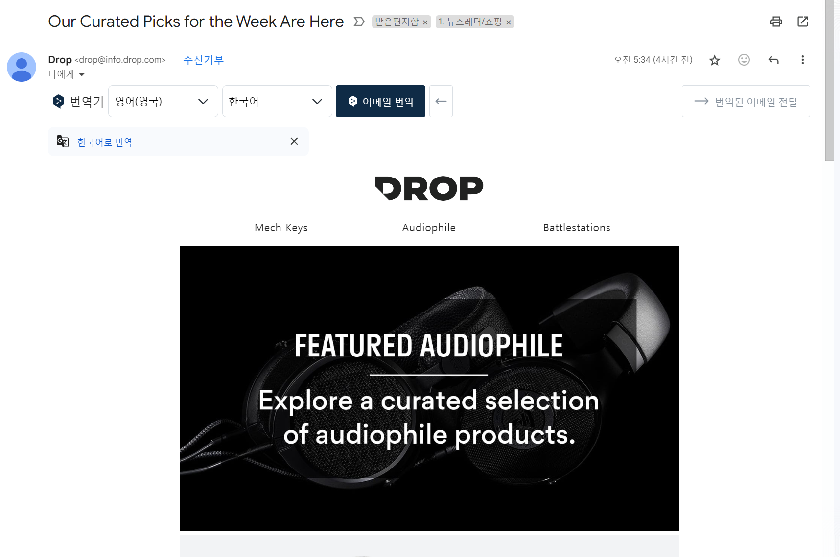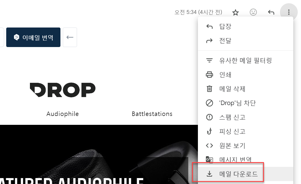 가령, 드랍닷컴의 메일 템플릿의 html을 확인하고 싶을 때 수신 된 메일의 eml 파일을 먼저 다운로드합니다.