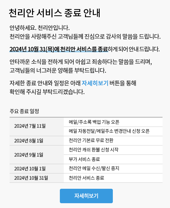 천리안 서비스 종료에 따른 메일 서비스 종료 안내