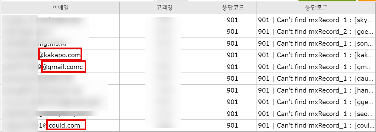 발송 실패 메일 중 포탈사이트 오타도메인으로 추정 되는 메일주소의 도메인을 복사합니다.