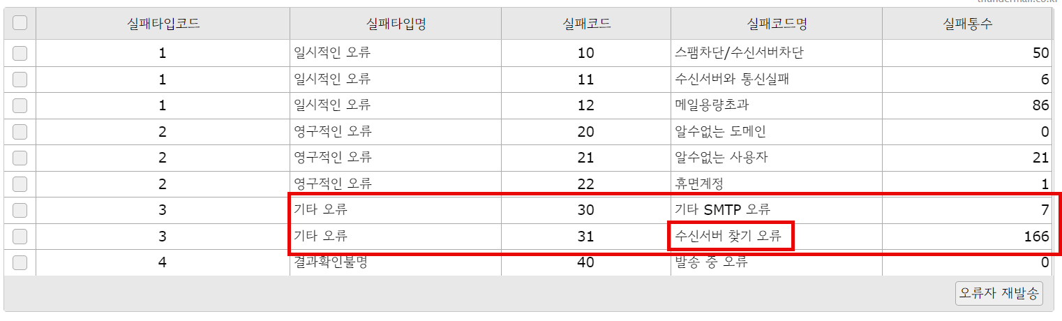 대량메일 - 발송현황리스트 - 각대량메일의 '실패원인별 통계' - 기타오류 - 실패코드(30, 31)