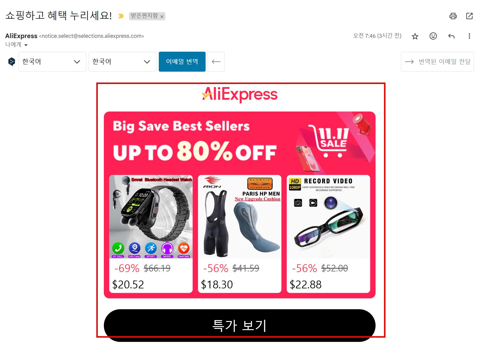 알리익스프레스에서 광군제 관련 마케팅 메일이 수신되어 외형과 소스를 분석해 보았습니다.