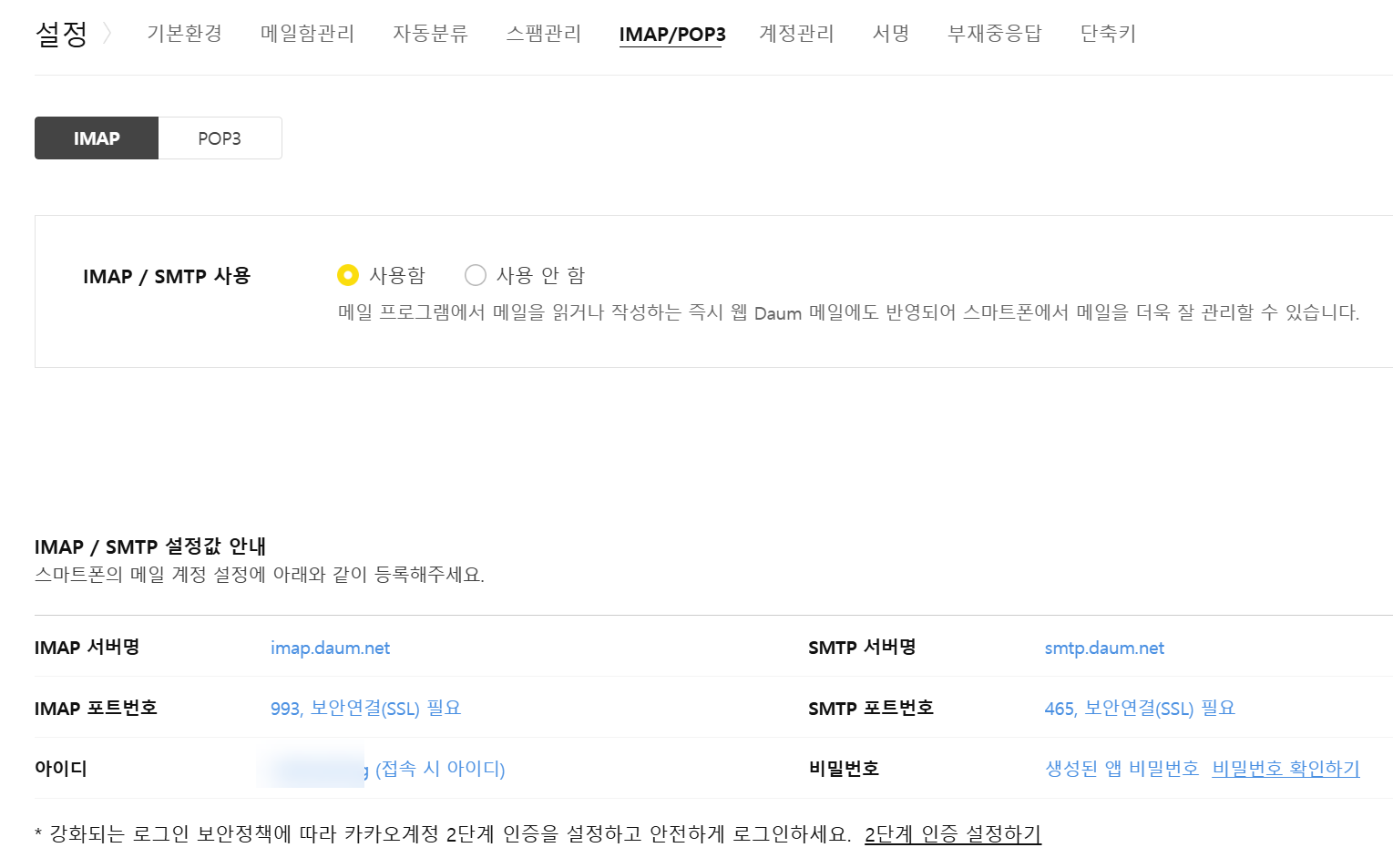 휴면계정 미변경 방법은 모바일 메일앱을 사용하거나 아웃룩 같은 프로그램에서 imap, pop3 등을 사용하면 됩니다.