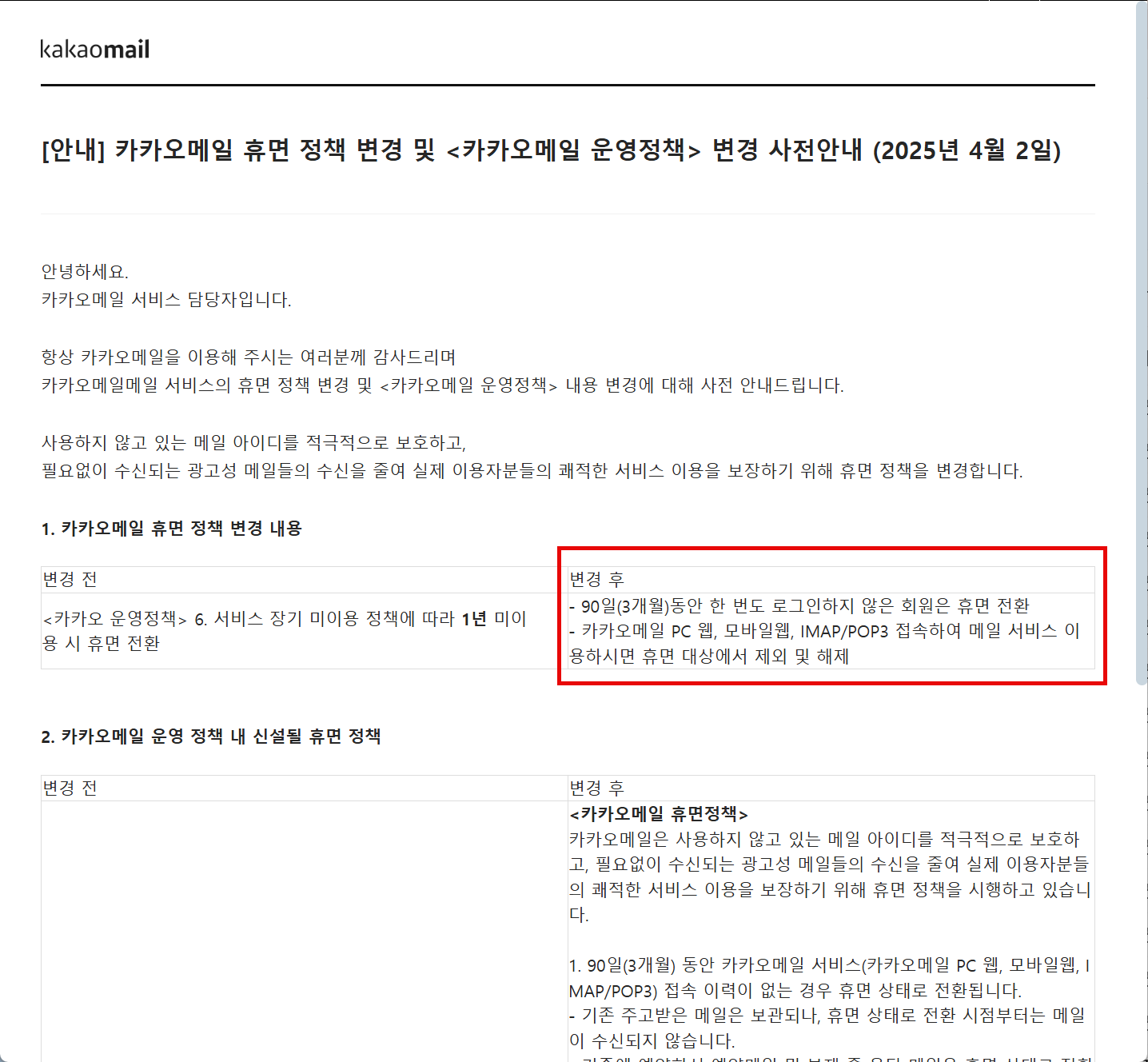 다음메일, 카카오메일 휴면 정책 변경 안내입니다.