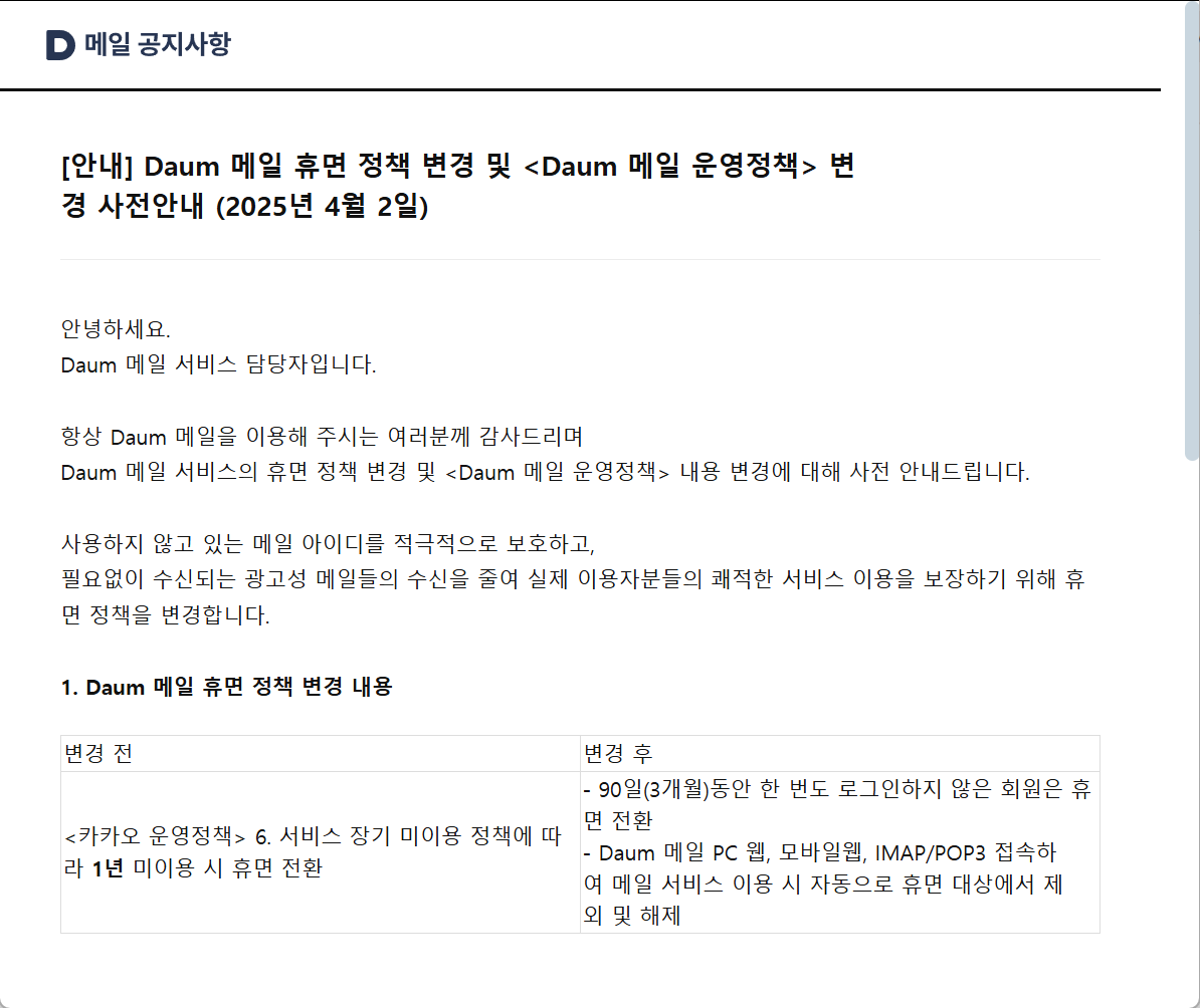 다음메일, 카카오메일 휴면 정책 변경 안내입니다.