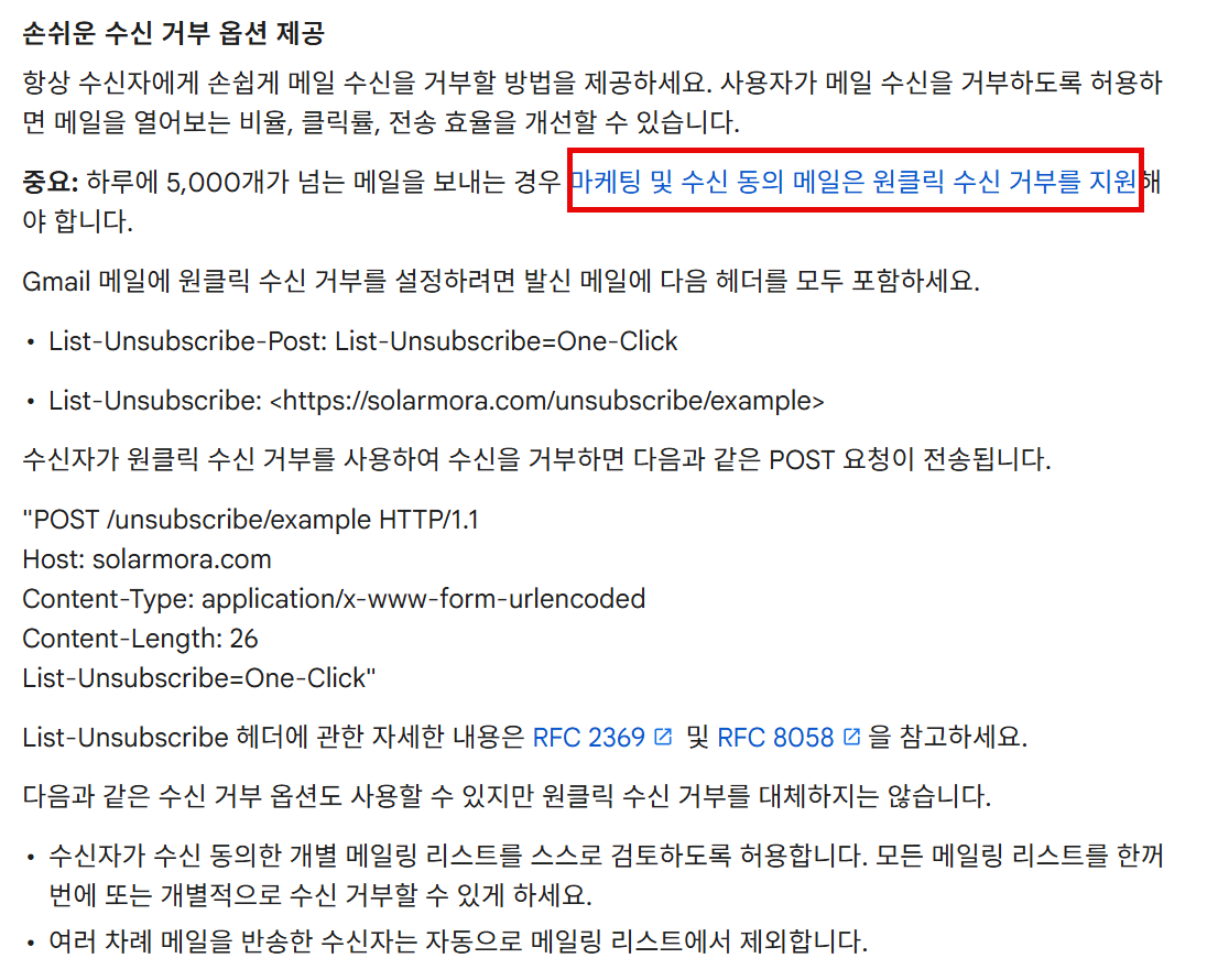 즉, 자동메일성 메일이 아닌 대량메일은 메일 헤더에 수신거부 관련 기능을 추가해야 한다는 의미입니다.