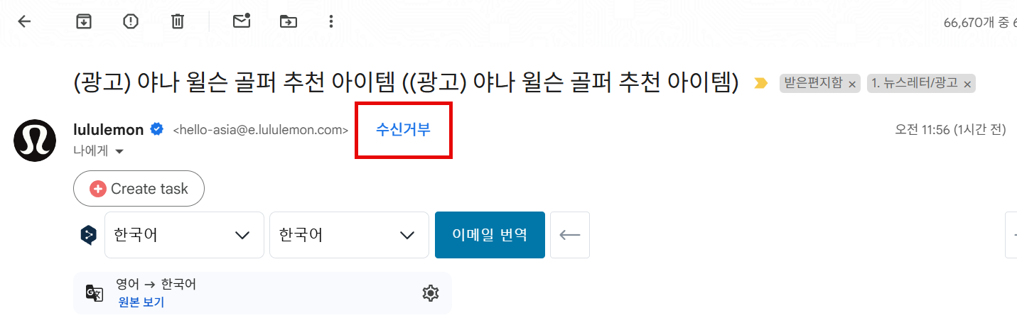 메일 헤더에 List-Unsubscribe-Post가 적용되어도 발송 환경에 따라 '수신거부' 문구 노출이 되지 않을 수도 있습니다.