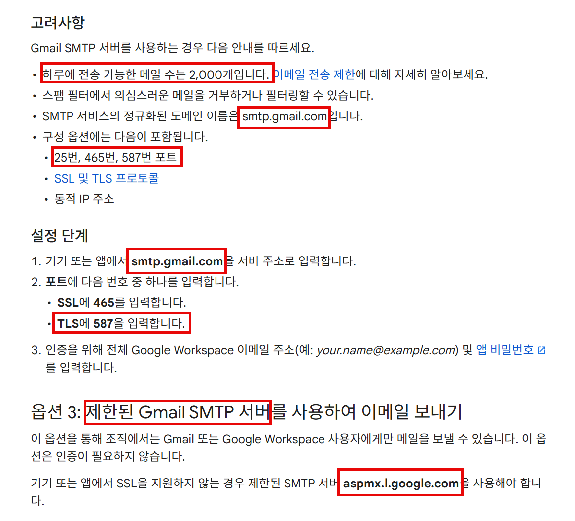 '제한된 Gmail SMTP 서버' 주소가 aspmx.l.google.com 입니다. 2023년 이전의 구글 워크스페이스 주소와 동일한 것을 확인할 수 있습니다.