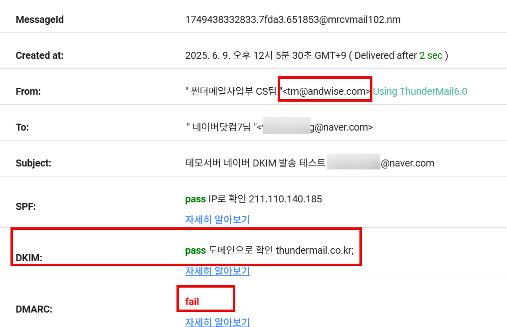 DKIM 인증이 되지 않는 경우, 네이버 메일 수신 서버에 도착하지 않고 차단될 수 있습니다.