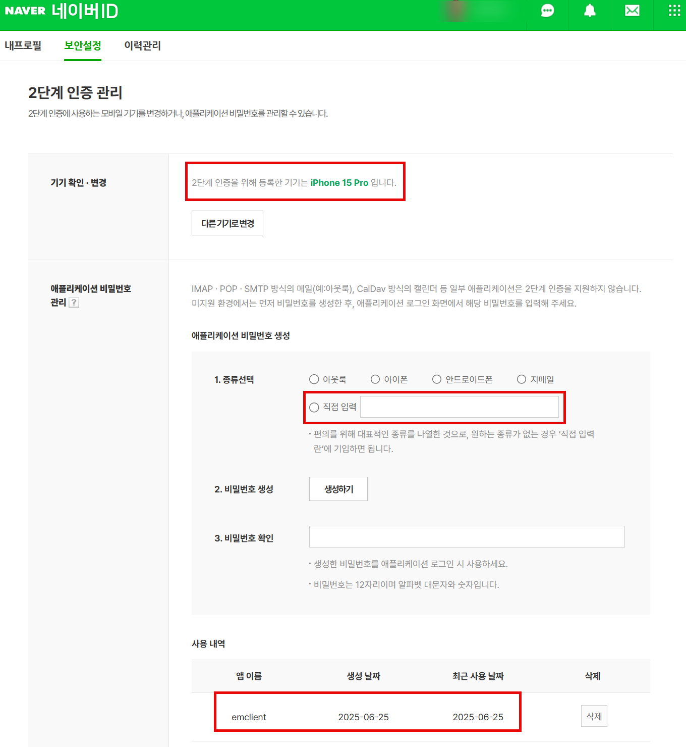 보안설정에서 앱 비밀번호 생성이 가능합니다. 한번만 노출 되기 때문에 노출되는 비밀번호를 어딘가에 저장 후 사용해야 합니다.