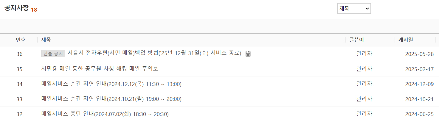 서울시 전자우편 서비스 종료일: 2025년 12월 31일